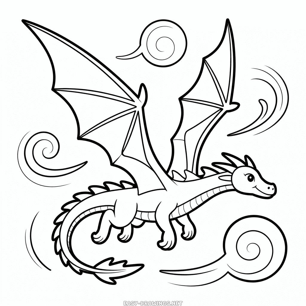 Simple drawing of Air Dragon to print for free, this flying mythical creature is designed with beginners in mind, making it an enchanting and easy introduction to dragon drawing for kids. Simple coloring page to reproduce or color for kids. High-resolution image, perfect for A4 PDF printing in black and white.