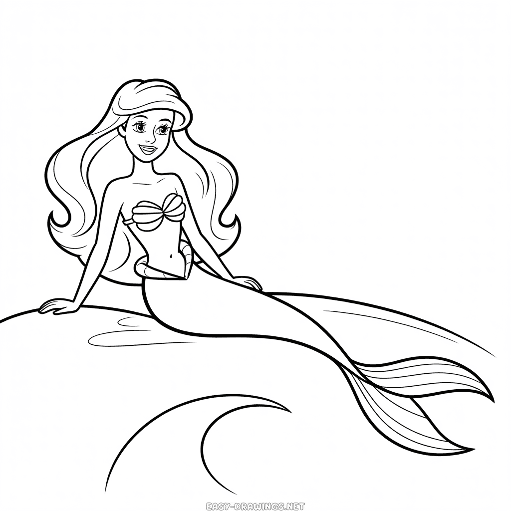 Simple drawing of Ariel Barbie to print for free, featuring the beloved mermaid princess in a fun and approachable style perfect for young artists. Simple coloring page to reproduce or color for kids. High-resolution image, perfect for A4 PDF printing in black and white.