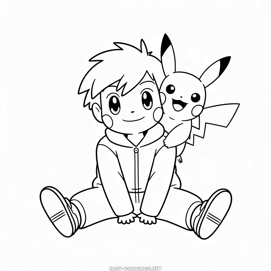 Simple drawing of Ash Ketchum with Pikachu Pokémon to print for free, featuring the legendary duo from Pokémon ready for your creative touch. Simple coloring page to reproduce or color for kids. High-resolution image, perfect for A4 PDF printing in black and white.