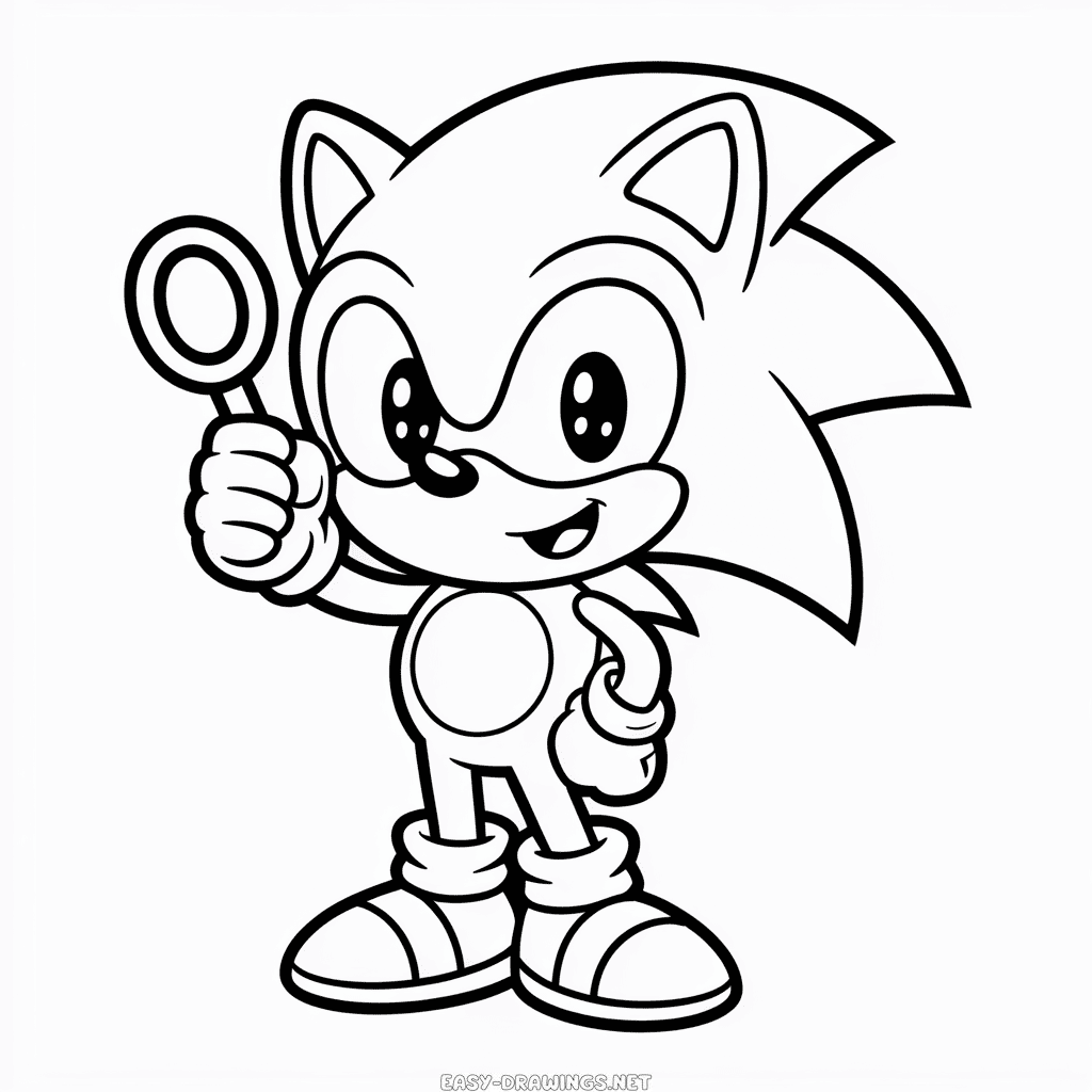 Simple drawing of Chibi Sonic to print for free, featuring a cute and small version of the famous blue hedgehog perfect for young Sonic fans. Simple coloring page to reproduce or color for kids. High-resolution image, perfect for A4 PDF printing in black and white.