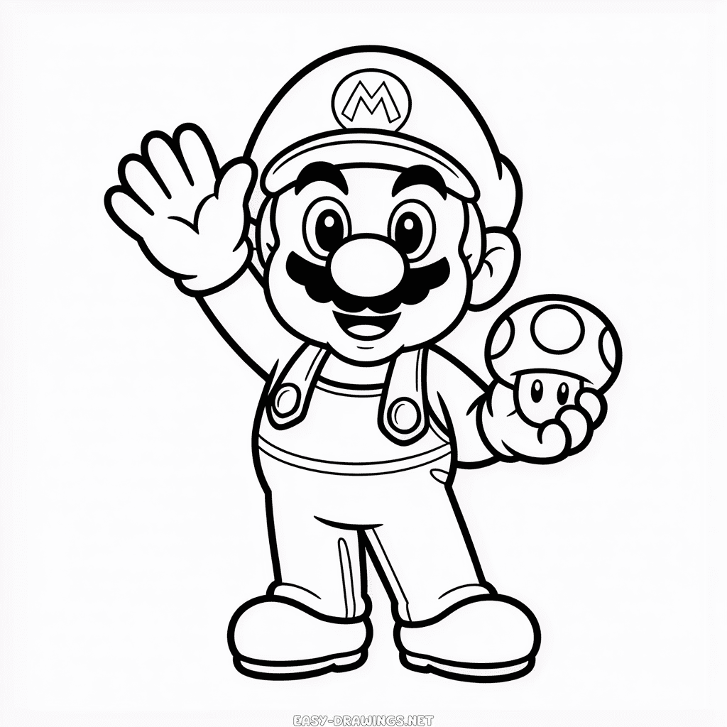 Simple drawing of Classic Mario to print for free, perfect for kids and beginners to recreate or color as they bring the iconic video game character to life. Simple coloring page to reproduce or color for kids. High-resolution image, perfect for A4 PDF printing in black and white.
