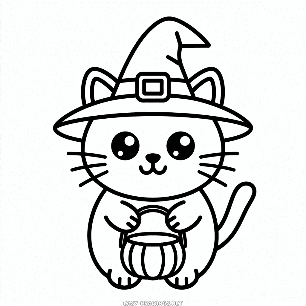 Simple drawing of Cute Halloween Cat to print for free, a charming feline adorned with a playful witch hat perfect for the spooky season. Simple coloring page to reproduce or color for kids. High-resolution image, perfect for A4 PDF printing in black and white.