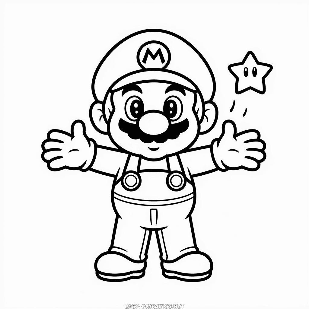 Simple drawing of cute kawaii Mario to print for free, featuring the charming and beloved character reimagined in an adorable, beginner-friendly style. Simple coloring page to reproduce or color for kids. High-resolution image, perfect for A4 PDF printing in black and white.
