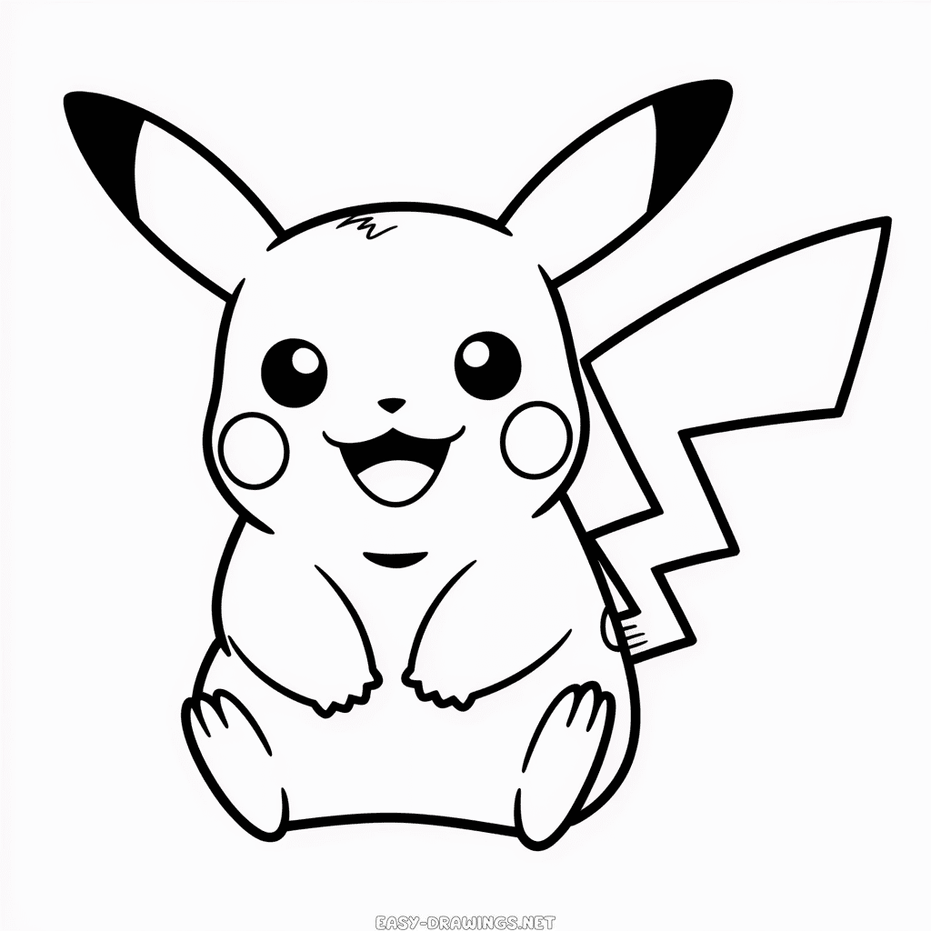 Simple drawing of Kawaii Pikachu to print for free, featuring the beloved electric mouse character in an adorable, cartoon-style design. Simple coloring page to reproduce or color for kids. High-resolution image, perfect for A4 PDF printing in black and white.