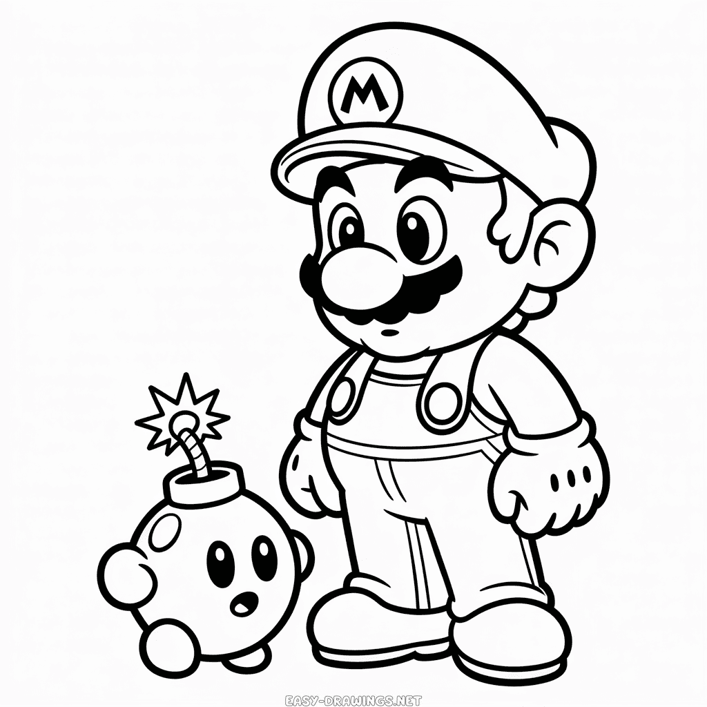 Simple drawing of Mario Bomb to print for free, featuring the iconic cartoon bomb with a fuse and fun, round design perfect for kids and beginners. Simple coloring page to reproduce or color for kids. High-resolution image, perfect for A4 PDF printing in black and white.