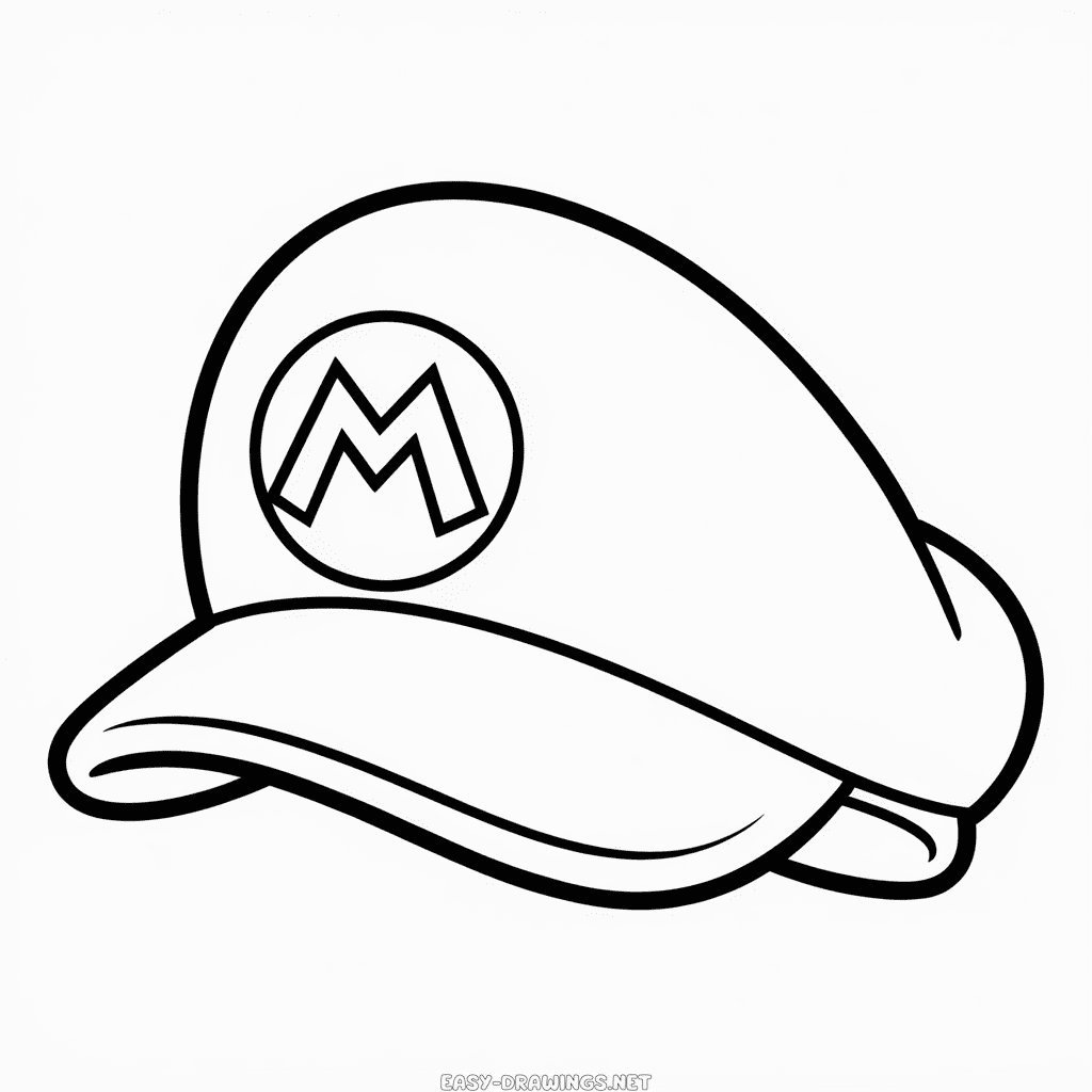 Simple drawing of Mario Hat to print for free, a delightful depiction of the famous red hat featuring a prominent ‘M’ that kids will love. Simple coloring page to reproduce or color for kids. High-resolution image, perfect for A4 PDF printing in black and white.