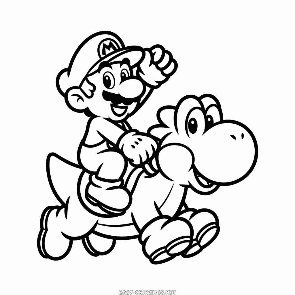 Simple drawing of Mario on Yoshi to print for free, featuring the friendly duo ready for a fun adventure. Simple coloring page to reproduce or color for kids. High-resolution image, perfect for A4 PDF printing in black and white.