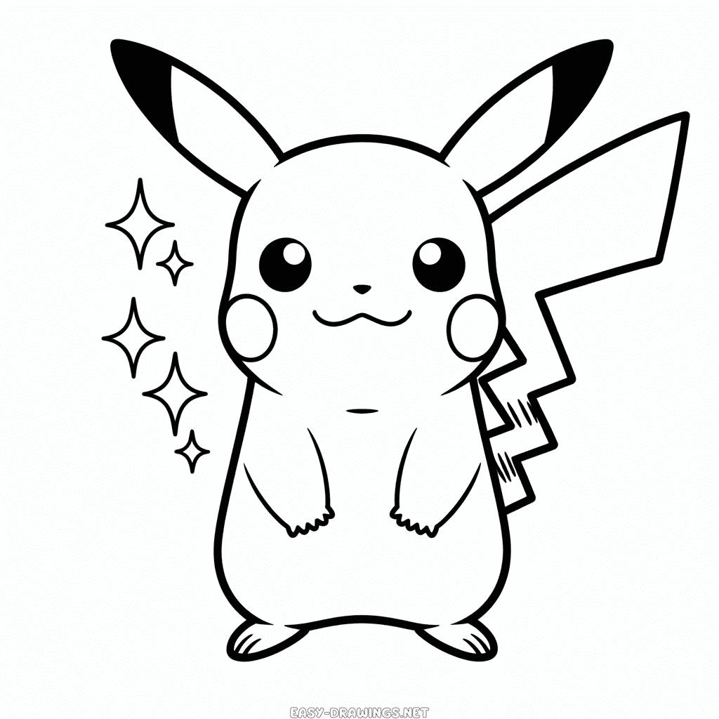 Simple drawing of Pikachu to print for free, featuring the adorable Pokémon with its cheerful expression and iconic lightning bolt-shaped tail. Simple coloring page to reproduce or color for kids. High-resolution image, perfect for A4 PDF printing in black and white.