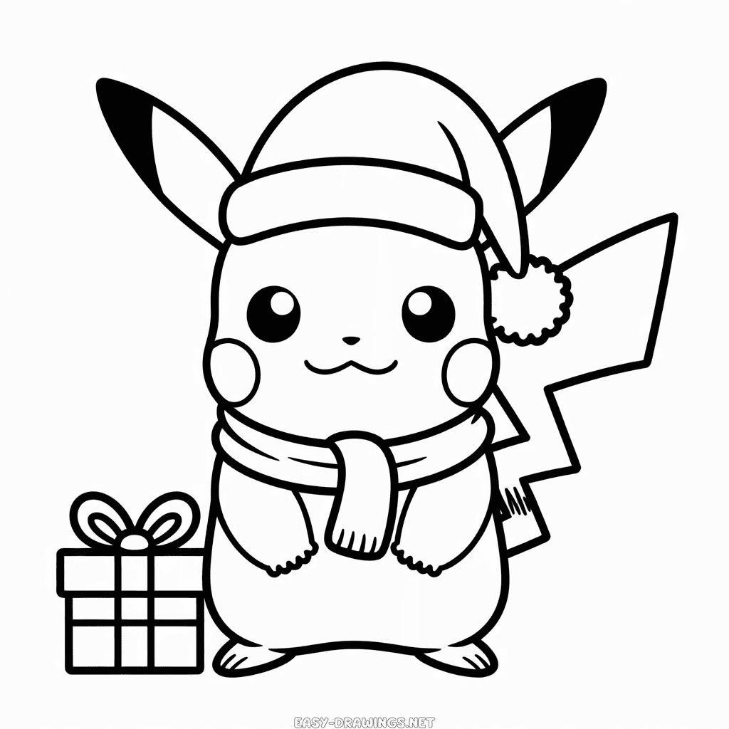 Simple drawing of Pikachu Santa to print for free, featuring the beloved Pokémon in a festive Santa outfit with a jolly expression. Simple coloring page to reproduce or color for kids. High-resolution image, perfect for A4 PDF printing in black and white.