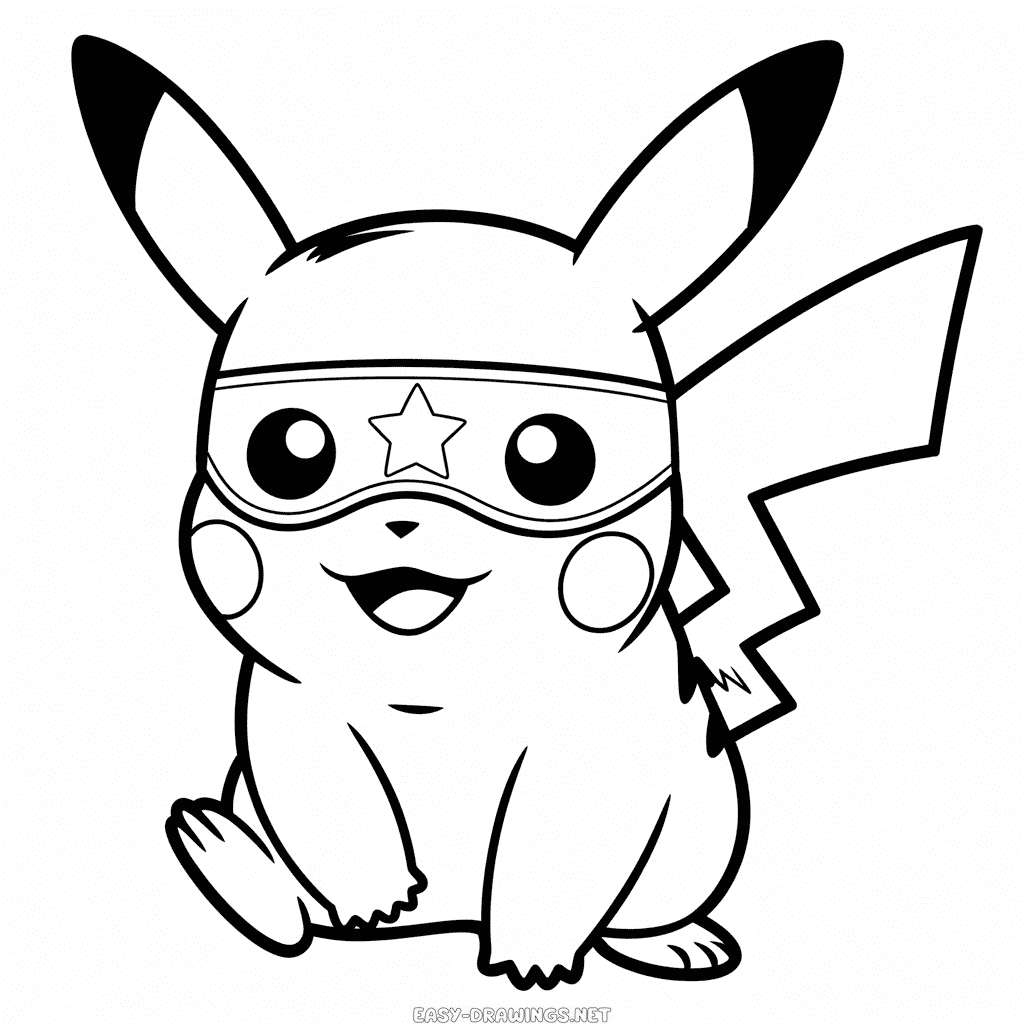Simple drawing of Pikachu with Mask to print for free, featuring the beloved Pokemon character with a playful disguise that kids will enjoy. Simple coloring page to reproduce or color for kids. High-resolution image, perfect for A4 PDF printing in black and white.