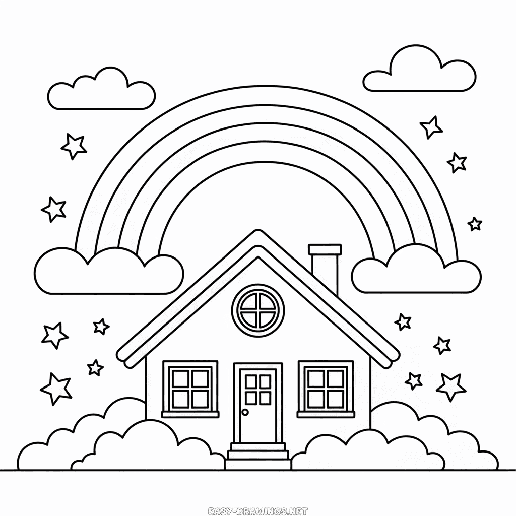 Simple drawing of a rainbow in fall to print for free, featuring a delightful arch of colors set against the warm hues of autumn leaves. Simple coloring page to reproduce or color for kids. High-resolution image, perfect for A4 PDF printing in black and white.