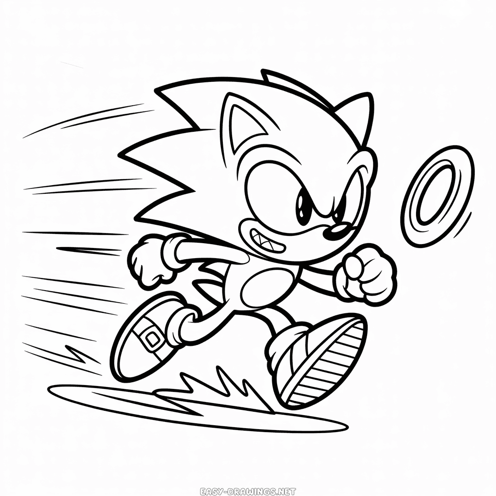 Simple drawing of Sonic Dash to print for free, capturing the speedy superhero hedgehog in a dynamic pose. Simple coloring page to reproduce or color for kids. High-resolution image, perfect for A4 PDF printing in black and white.