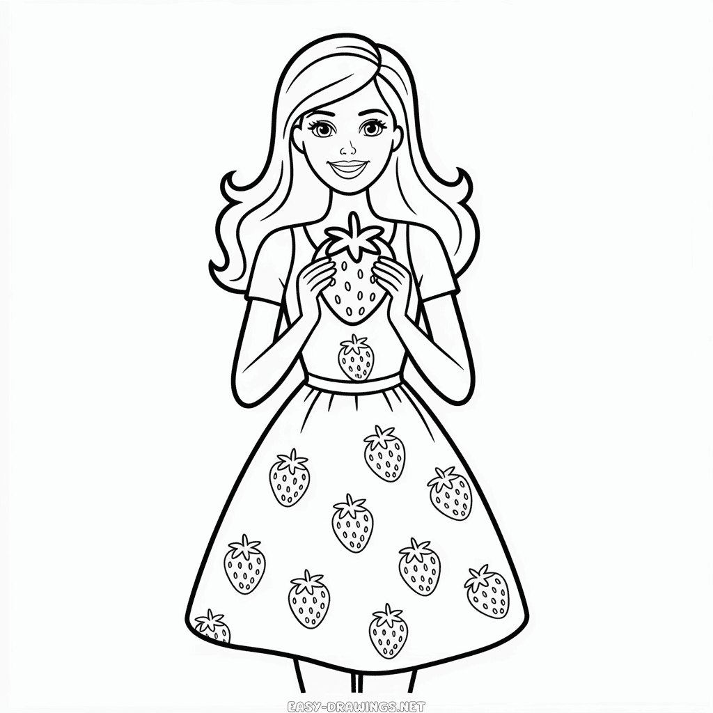 Simple drawing of Strawberry Barbie to print for free, featuring a delightful depiction of Barbie styled with a strawberry theme, perfect for young artists to enjoy. Simple coloring page to reproduce or color for kids. High-resolution image, perfect for A4 PDF printing in black and white.